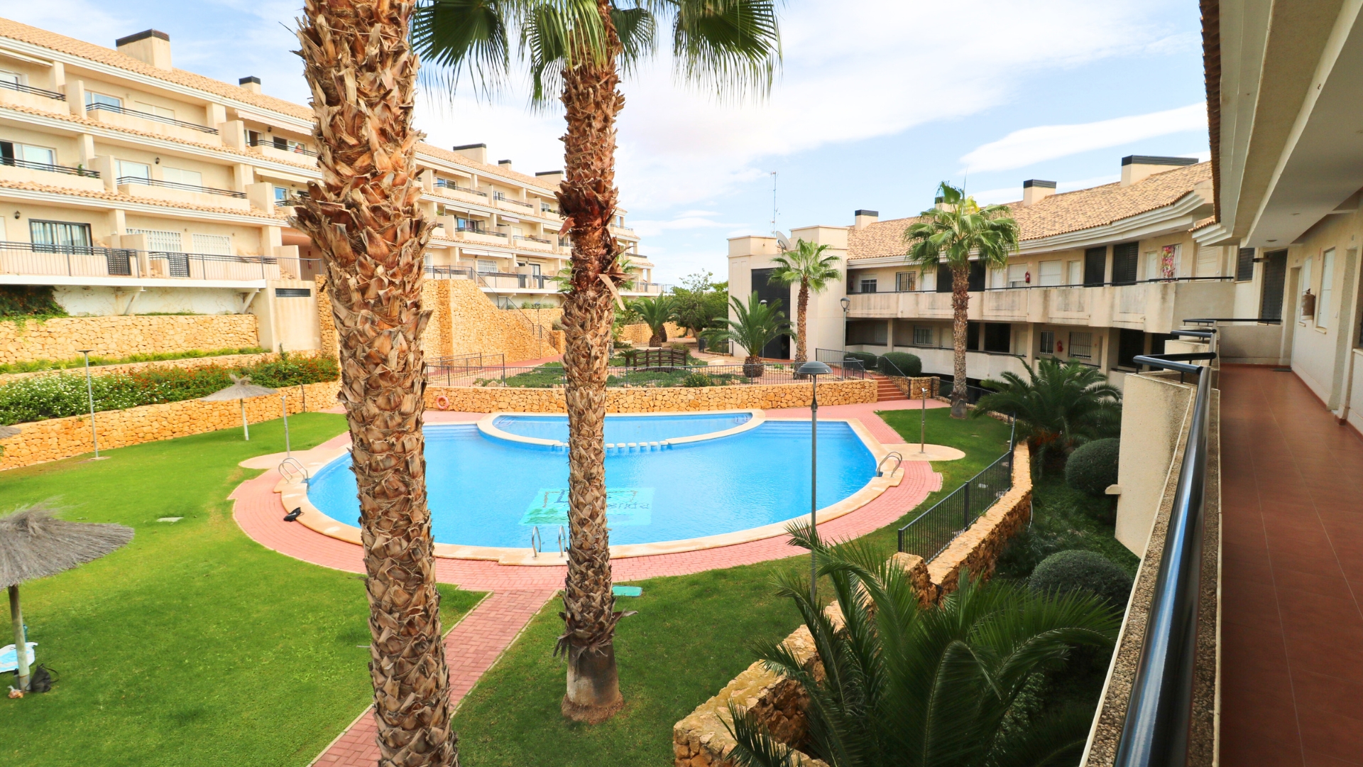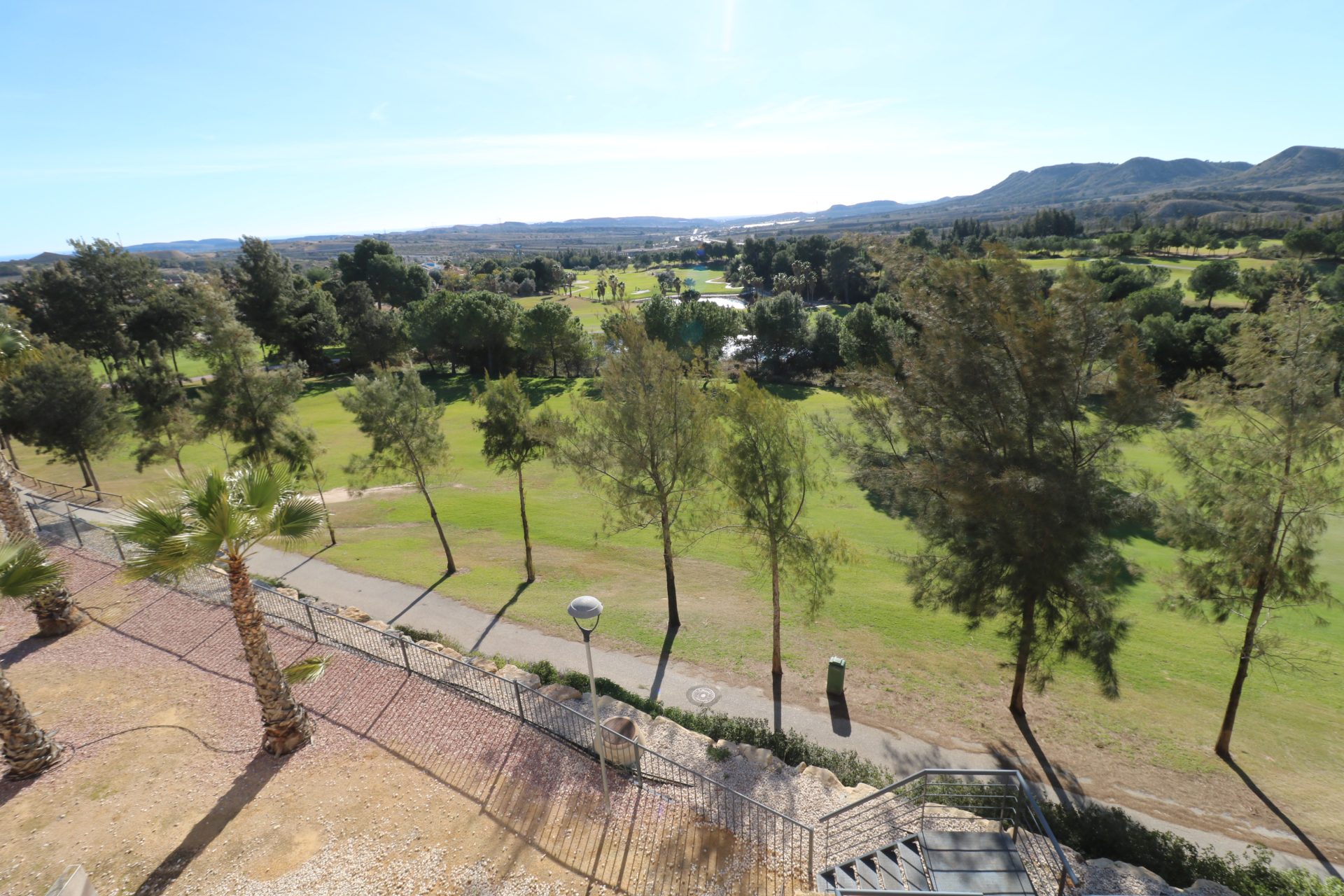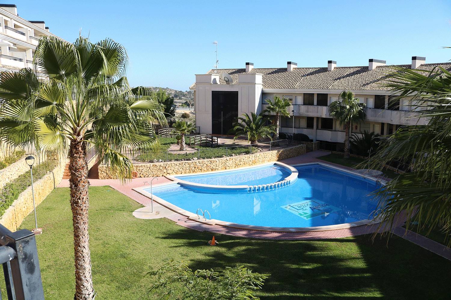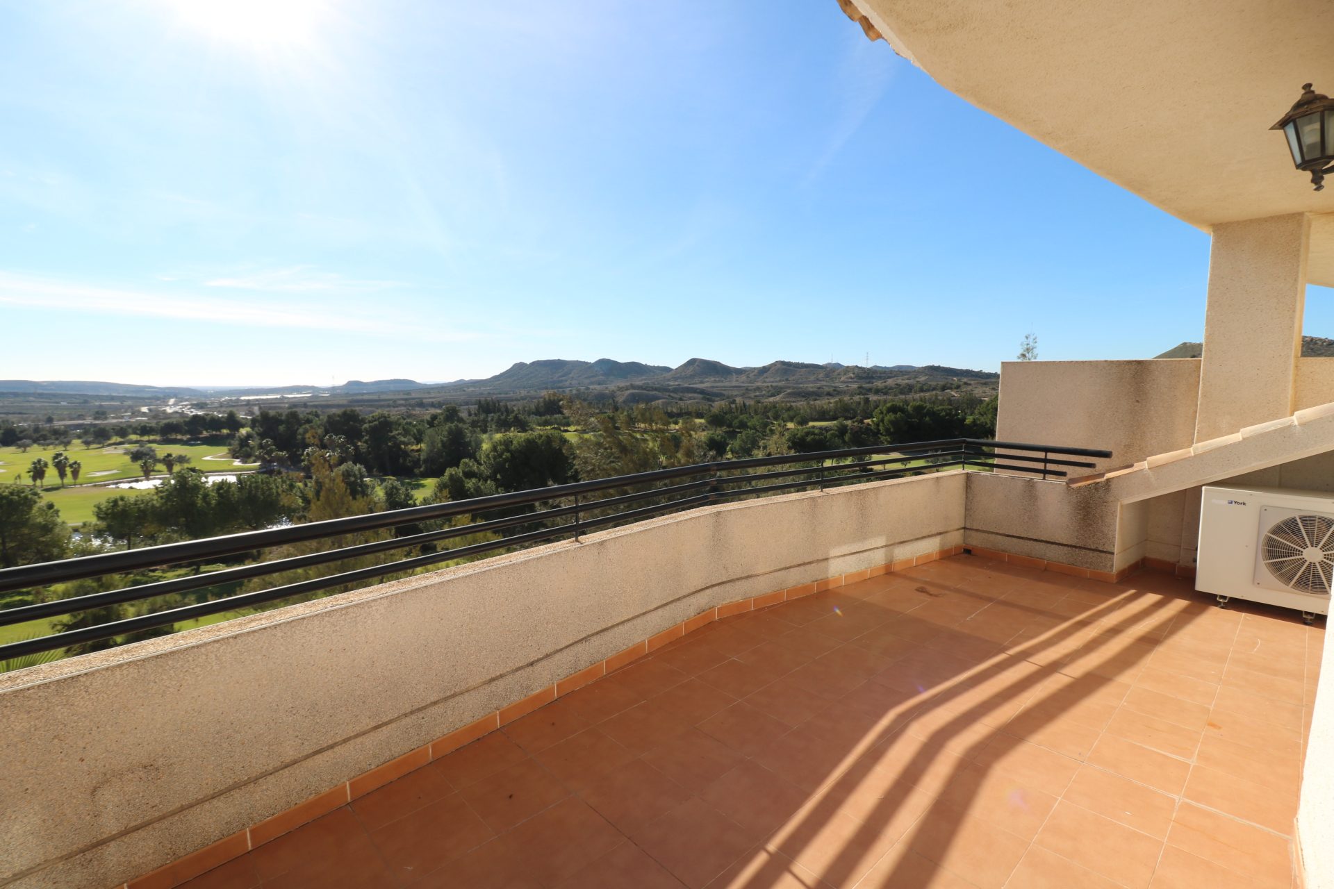 Bright 2-bed apartment: family bathroom plus a master double with fitted wardrobes, en-suite and direct balcony access. Sunny all day with gorgeous sunsets. Wide views over holes 10–12, the gardens, pool and dramatic scenery—plus a glimpse of the coast from the very large balcony.